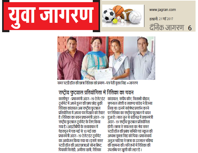 On the basis of her excellent performance in Under-19 Talent Hunt Tournament Ritika Kandpal of Samar Study Hall Sr. Sec. School, Kashipur got selected in Under-19 National Football Tournament.
