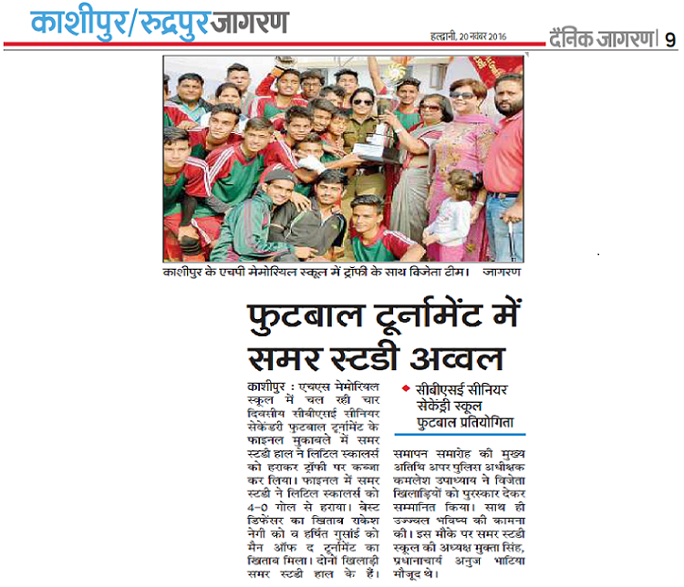 Samar Study Hall won Inter School Football Championship 2016 held at H.S.Memorial Public School organised by H.S.Memorial Public School, Kashipur beating Little Scholars by 4-0 in the finals. Rakesh Negi was adjudged the best defender & Harshit Gusai was adjudged ‘Man of the tournament’. School President Mrs. Mukta Singh congratulated the team & lauded the efforts made by them. School Principal Mr. Anuj Bhatia praised the sportsmanship shown by the players & congratulated the team for their brilliant win. Congratulations SSH!!