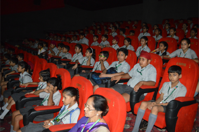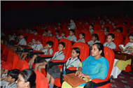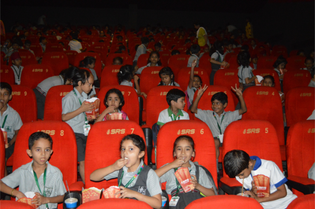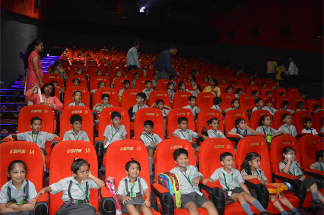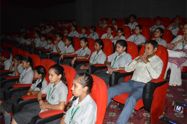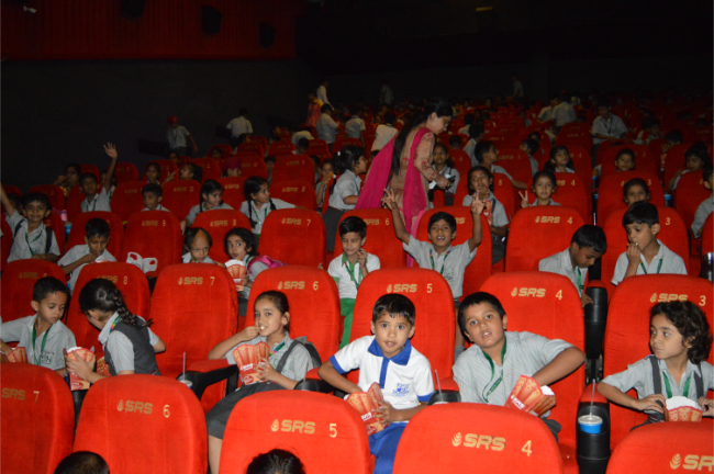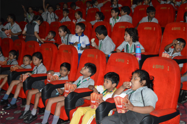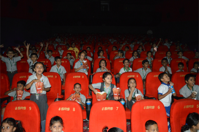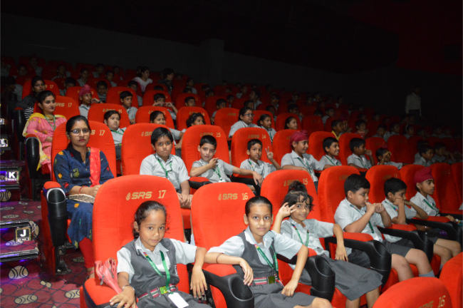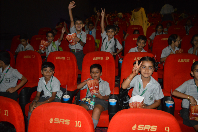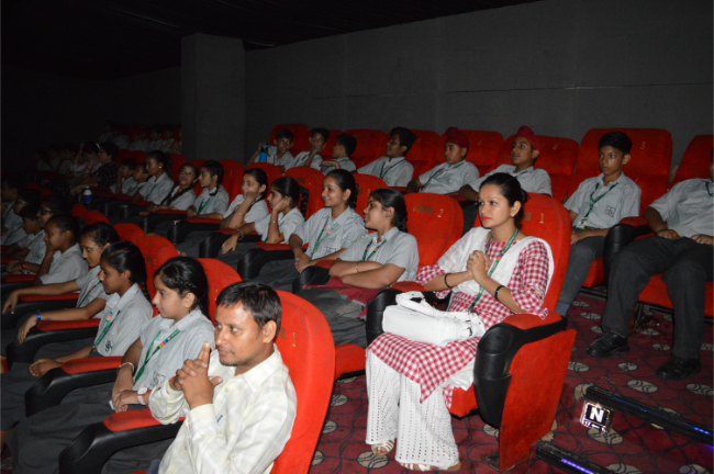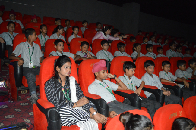 Description: Students enjoying movie in SRS Kashipur. The Lion King (Classes U.K.G to 8) Super 30 (Classes 9 to 12).